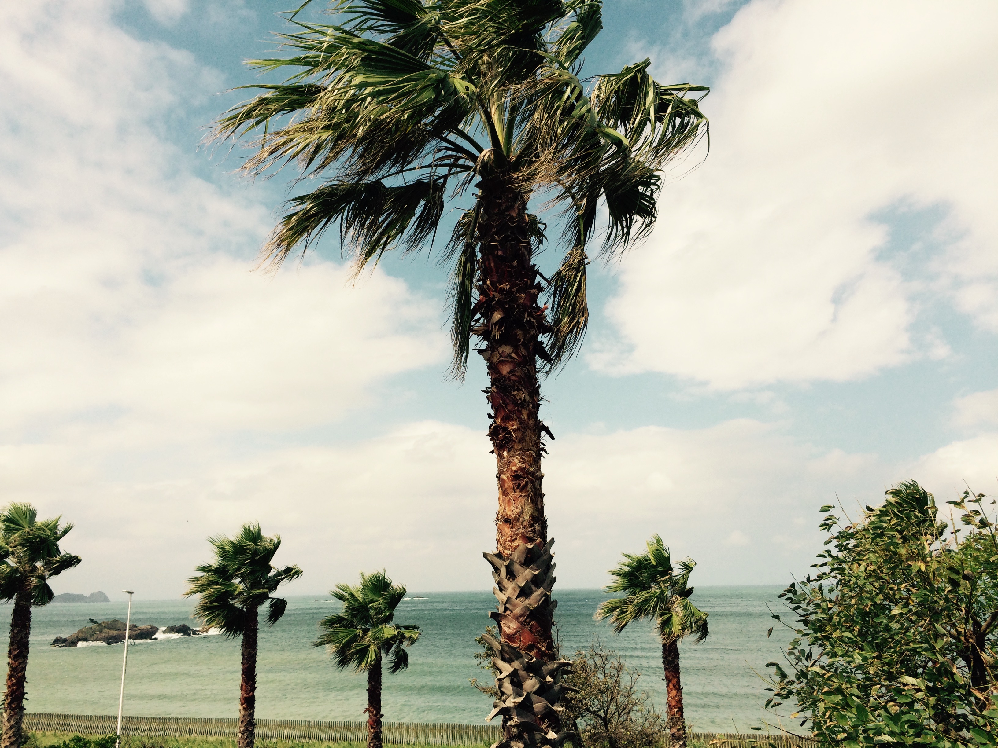 水平線と空の割合、椰子の木?がアクセントになって、フォトカードみたいと自画自賛。